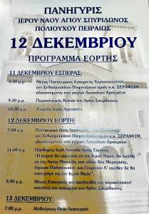 Στις εορταστικές εκδηλώσεις προς τιμήν του εν Αγίοις Πατρός ημών Σπυρίδωνος Επισκόπου Τριμυθούντος του Θαυματουργού, Πολιούχου της πόλεως του Πειραιά, στον μεγαλοπρεπή Ιερό Ναό του, το διήμερο 11 και 12 Δεκεμβρίου, κατόπιν ευγενούς προσκλήσεως οικείου Ποιμενάρχου, Σεβασμιωτάτου Μητροπολίτου Πειραιώς κ. Σεραφείμ.