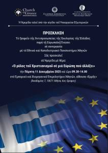 Στην επιστημονική ημερίδα με θέμα «Ο ρόλος του Χριστιανισμού σε μία Ευρώπη που αλλάζει», που διοργανώνει το Γραφείο της Αντιπροσωπείας της Εκκλησίας της Ελλάδος στις Βρυξέλλες, την Πέμπτη 11 Δεκεμβρίου, στο Εμπορικό και Βιομηχανικό Επιμελητήριο Αθηνών, κατόπιν ευγενούς προσκλήσεως του Διευθυντού του Γραφείου, Θεοφιλεστάτου Επισκόπου Τανάγρας κ. Αποστόλου.